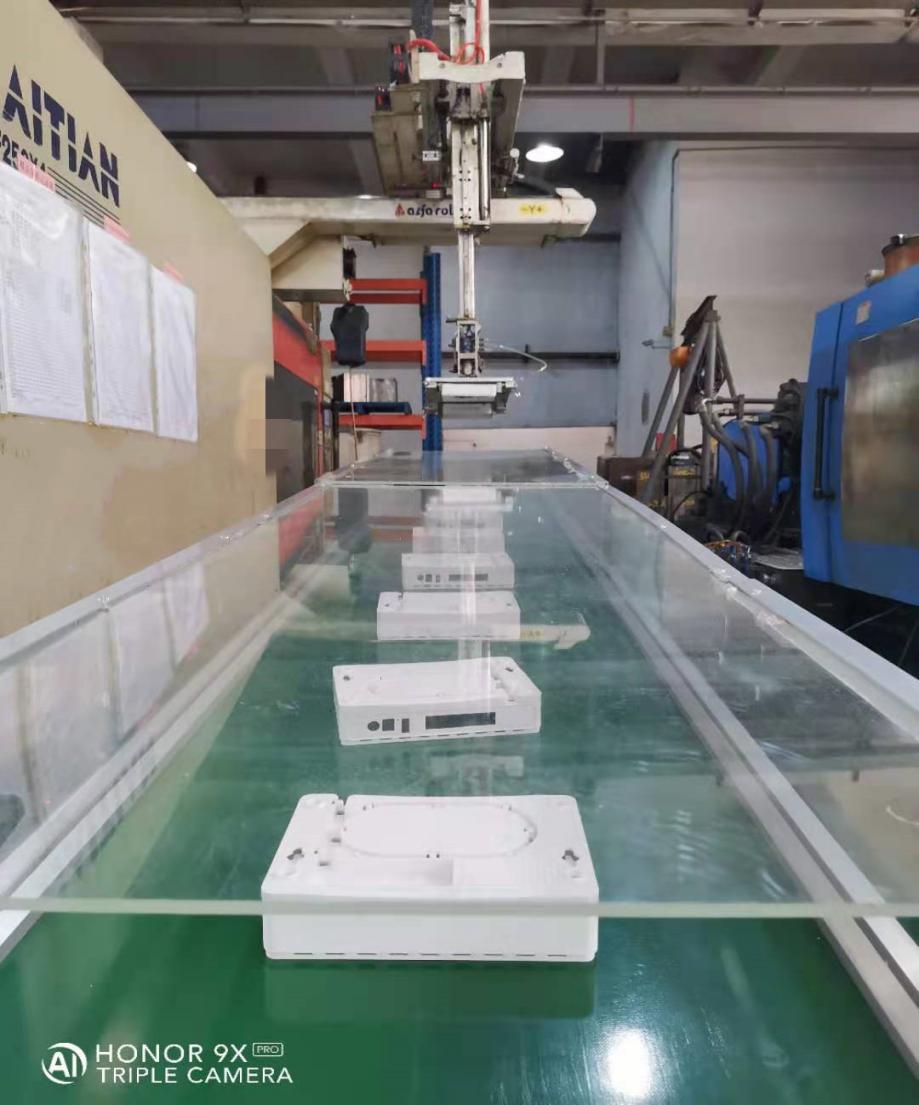 下蓋產(chǎn)品四周批鋒去除,不需要修件,2個(gè)產(chǎn)品通過設(shè)計(jì)合理的機(jī)械手治具,在生產(chǎn)中可以用機(jī)械手治具直接將產(chǎn)品抱住取下,成型周期控制到39秒以內(nèi);